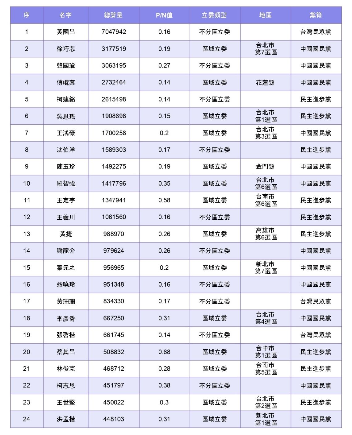 姓名 | 選區或類別 | 黨籍 | 總聲量 | P/N 值 |
