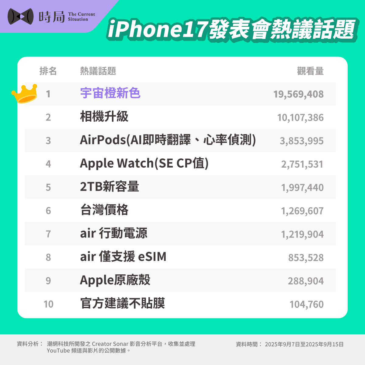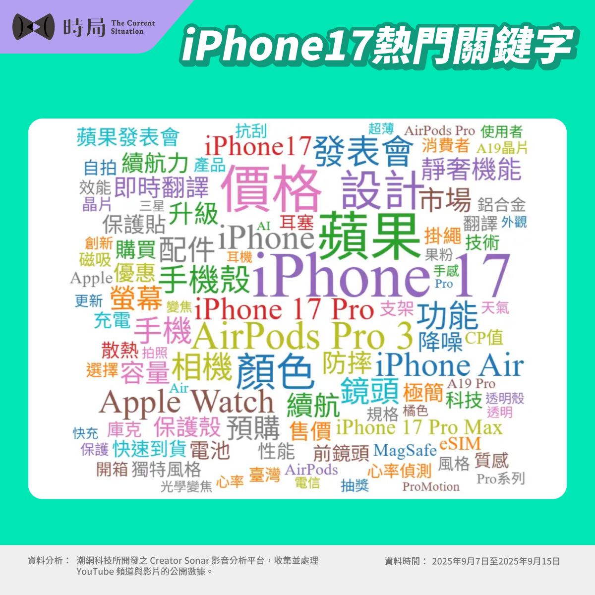 《時局》網路聲量觀察站從龐大的網路聲量中剖析真實樣貌。我們透過數據盤點,試圖揭露 iPhone 17 發表會過了一個月後,究竟引起了哪些討論、關注的面向又有哪些?文章將依據國內 YouTube 頻道的影片觀看數,帶您一窺社群最熱議的 10 大話題、剖析哪些影片成為話題的引爆點,並從中找出這次 iPhone 17 發表會的真正「流量密碼」。